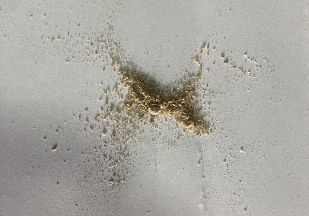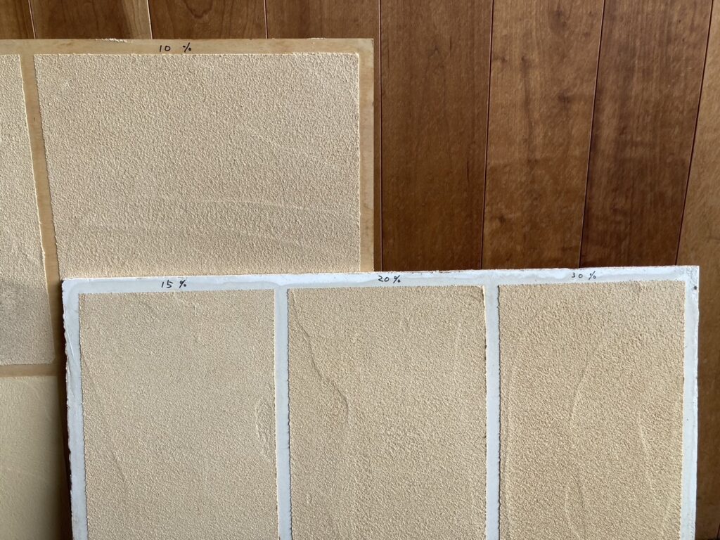 前回のボンド量を参考にさらに強化した3パターン作成し、Mokkunを塗ったボードをワイヤーブラシで擦る。ワイヤーブラシは10cm角の範囲を1分間擦り実験。剥がれた粉の量をもって測定を行う