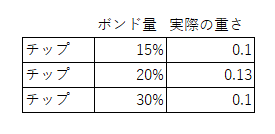 ボンドの量、3%・5%・7%・10%の4パターンを製作し、実験を行った結果は…。