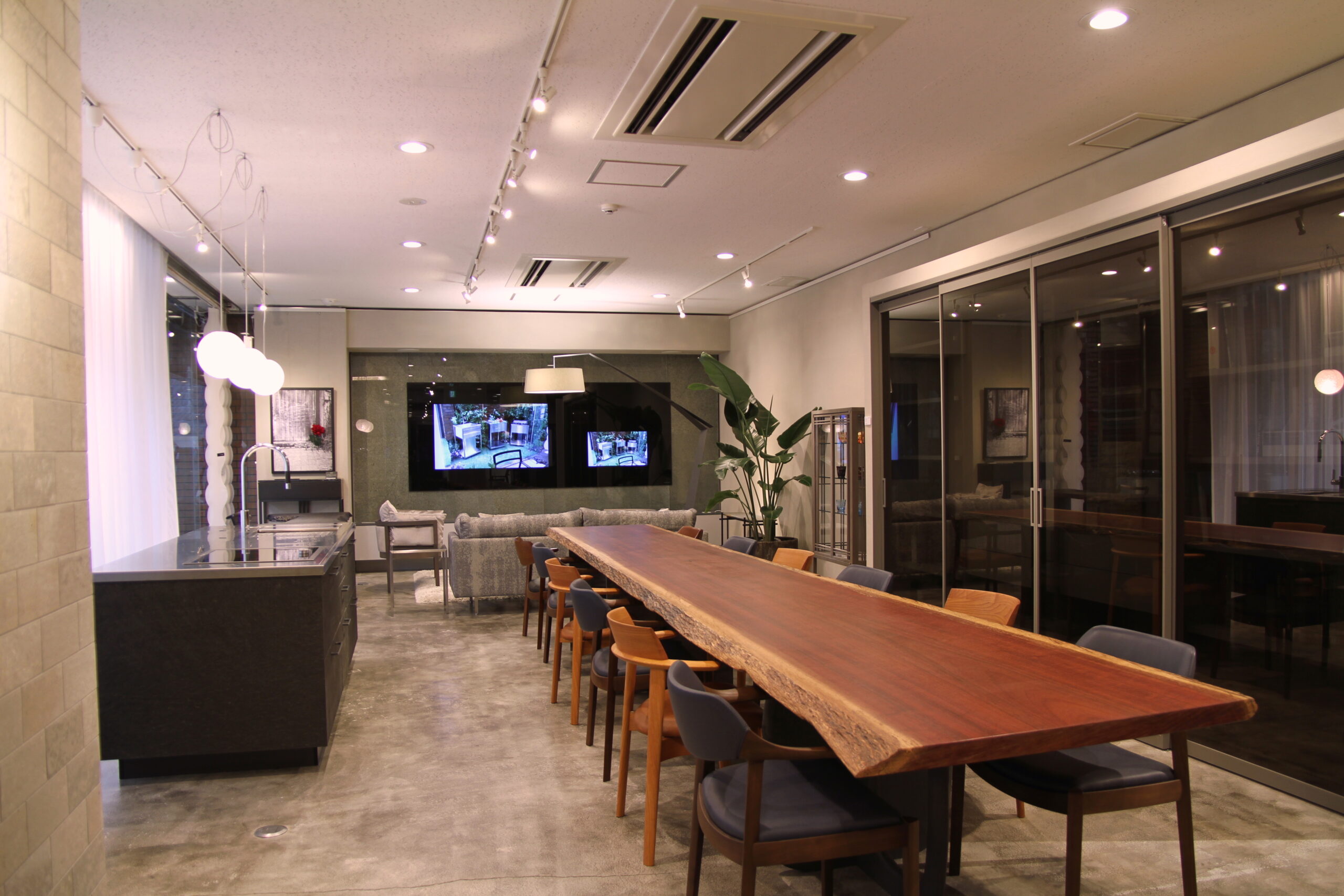 一枚板テーブルや木質家具を設えた空間での施工例。※正面テレビ背面はMokkunではありません。